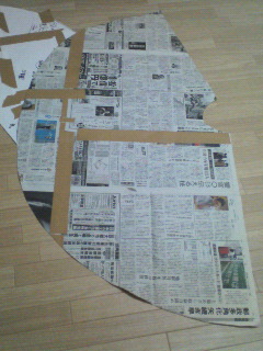 とりあえずそれっぽくて簡単そうな型紙をゲット(左上白い紙。プリントアウト後切り貼り)しまして、長さをすこし伸ばしてみました。型紙がロリータ系のケープなので、ちょっと短いんですよ。って新聞紙かよ、のツッコミは却下です。大きい紙といえば新聞紙。