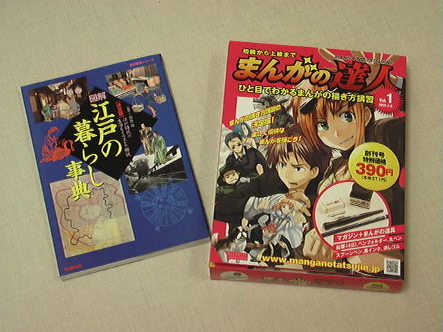 左は江戸生活の解説本。いや~こういうの1冊は欲しかったんですよ。なかなか読みやすくていいです。最近あんまり江戸ものは読んでないんですけどもネ。一昨年くらいからずーっと読みかけ(ヲイ)の「深川澪通り木戸番小屋」読むか・・・。