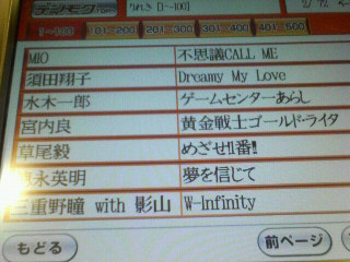 新しい曲ひとっつもないのにネ・・・。この中で一番新しい曲って「W-Infinity」・・・。あと、何だかんだ言って前回の別アニカラ大会で歌った歌をまた歌ってます。意外にレパートリーは少ないと見た!(そうか?)